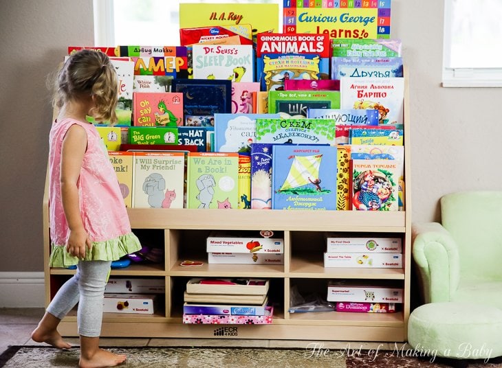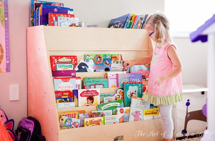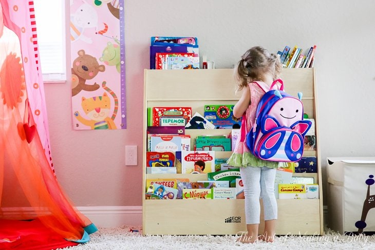 The back storage can be used for toys or out of season books. That’s where we store our holiday books: Christmas, Easter, Halloween, and pull them out when needed. The top section is used for books out of rotation and then regularly I switch some of the books out. You can see the size of this front facing bookshelf is pretty impressive, considering Lexi’s height in the photos is 38″, however despite the heavy solid wood, it is completely portable. It sits on wheels and can be pushed around if needed, which can be a very useful feature.