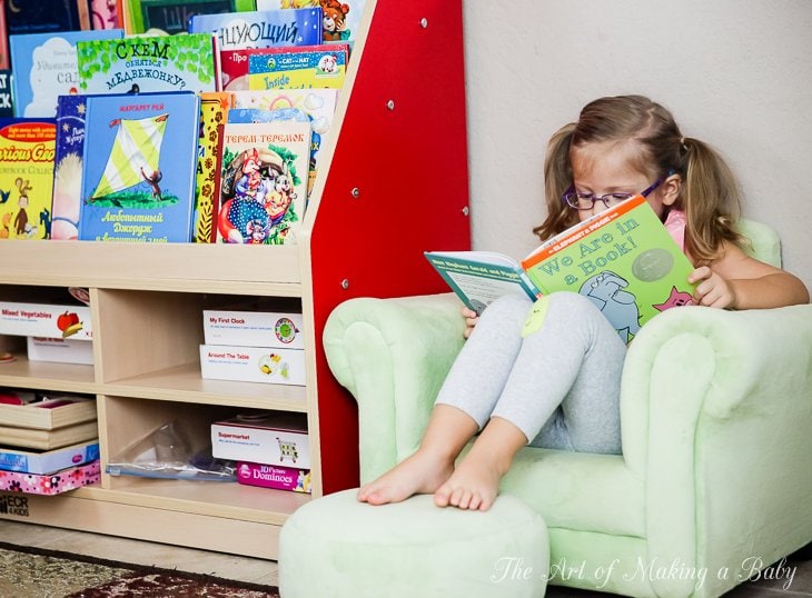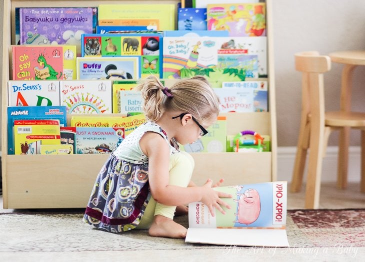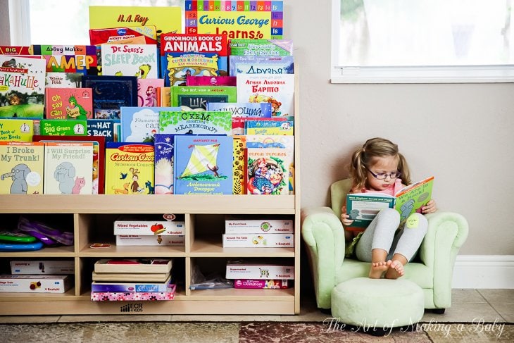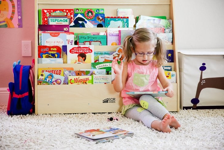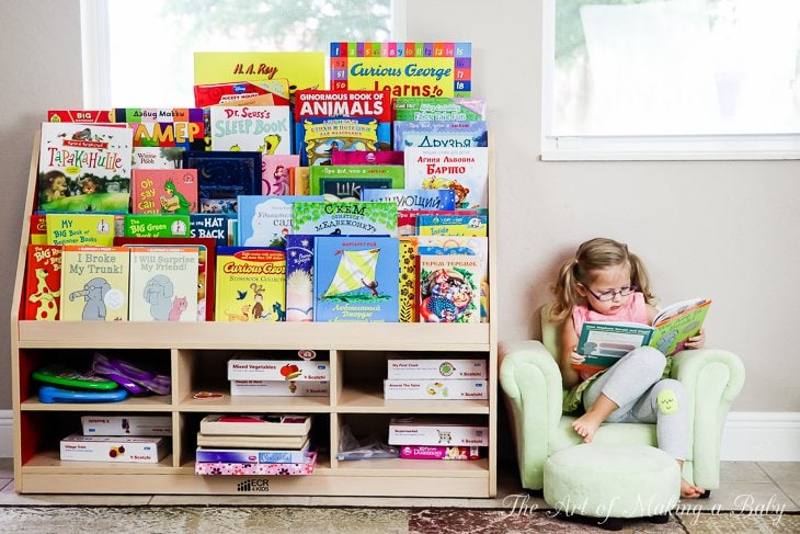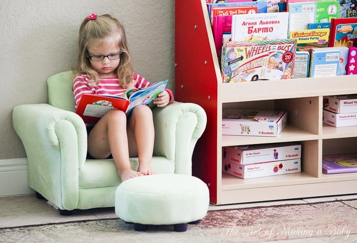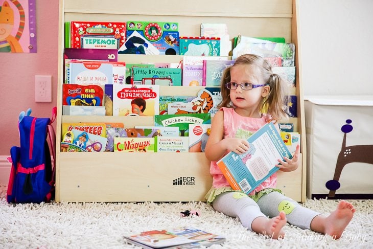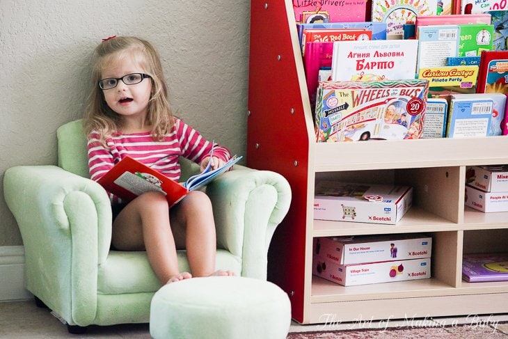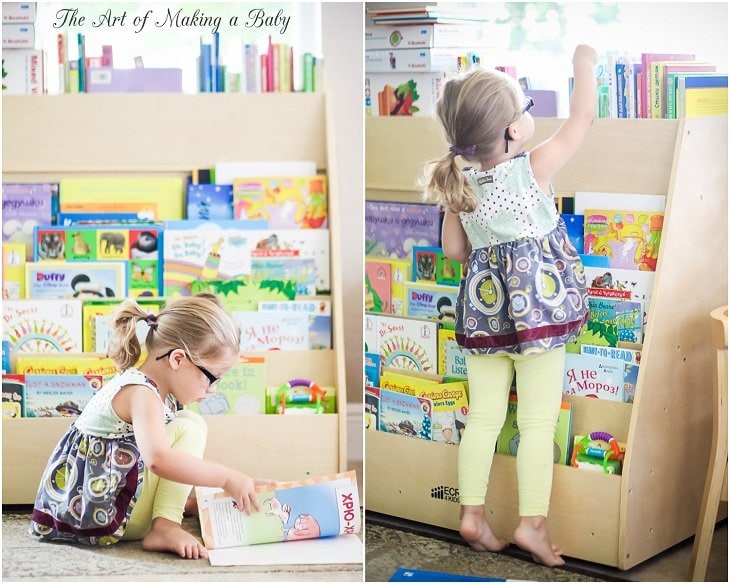 10. Front-facing bookshelves are especially good for kids with special needs! My friend, whose son has autism, bought a front-facing bookshelf this summer, and his interest in reading really has increased. At our house, though, we do keep our two-year-old’s books in bins, because I’m a doctoral student who doesn’t have much of a bookshelf budget right now. Good thing for us she adores books (She’s even begun teaching herself to read, which is the coolest, most amazing thing ever!) and doesn’t mind too much that her volumes of Dr. Seuss are a little disorganized at the moment! 🙂